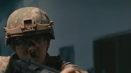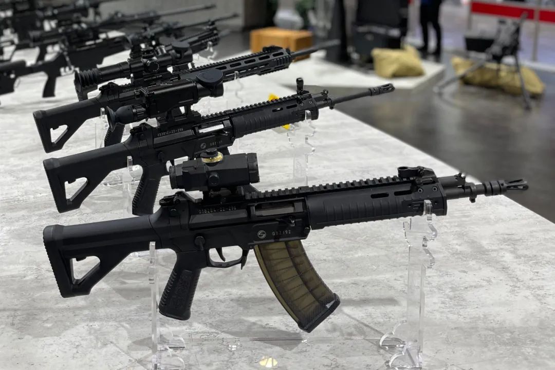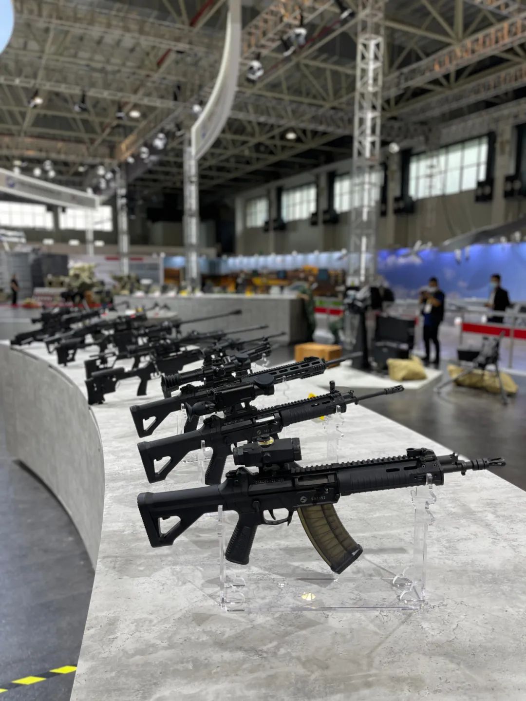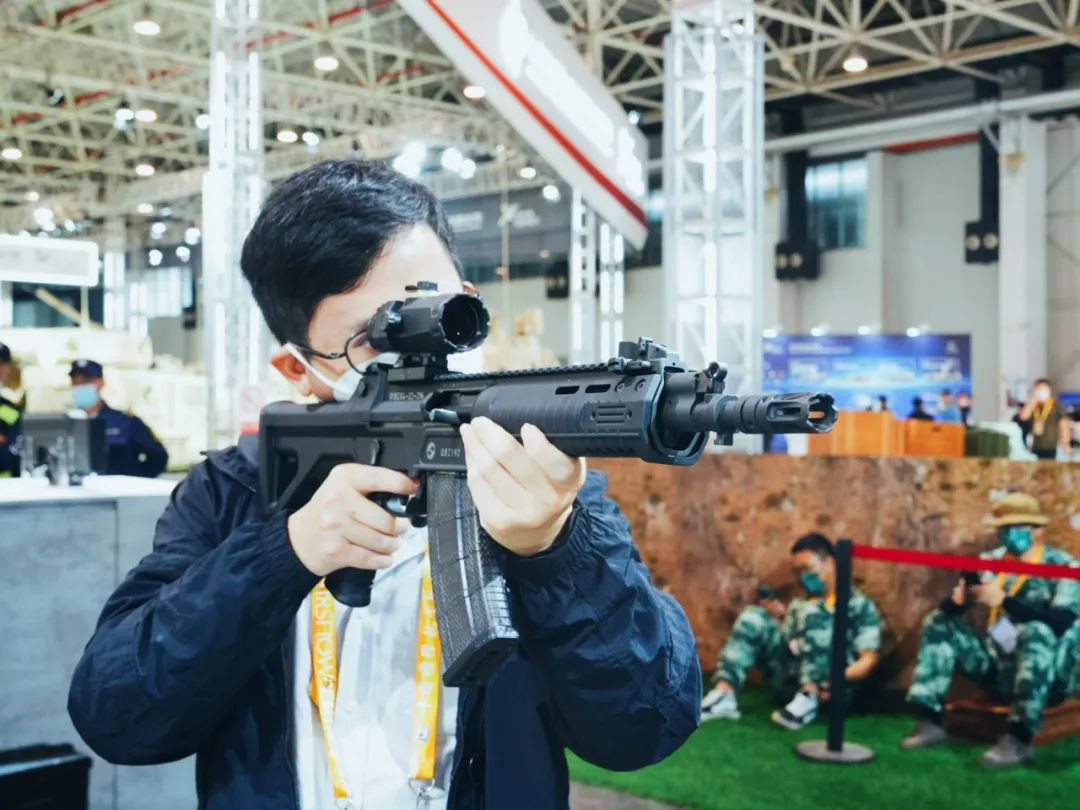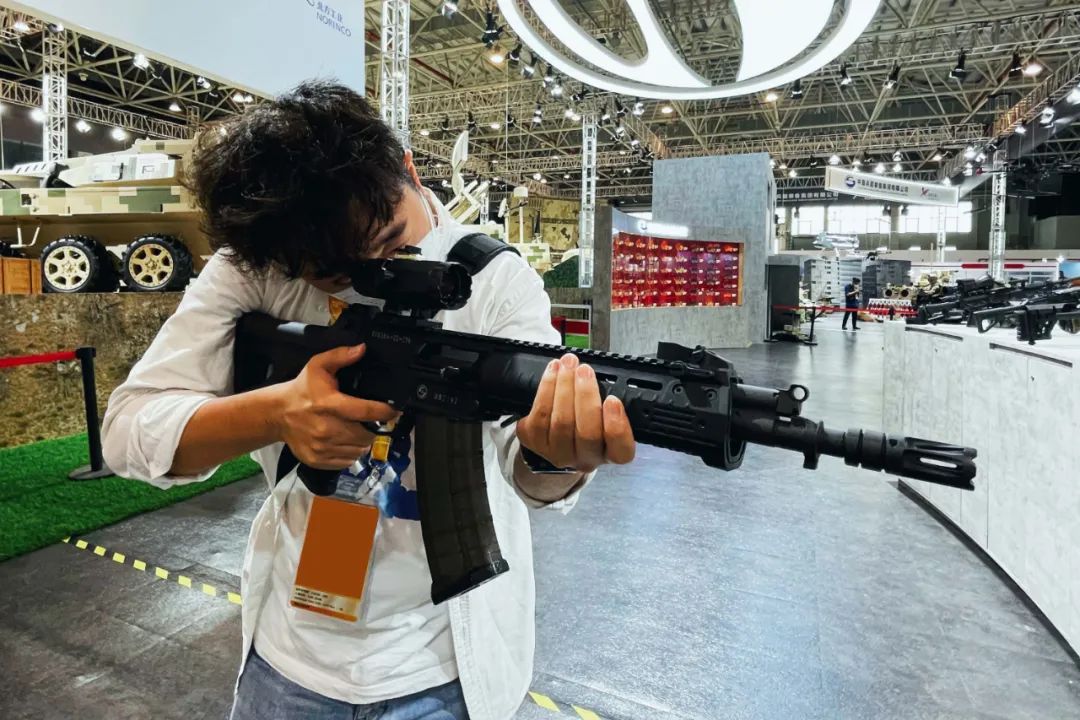 参观军迷体验“20式新枪族”中的QBZ192型短自动步枪。
